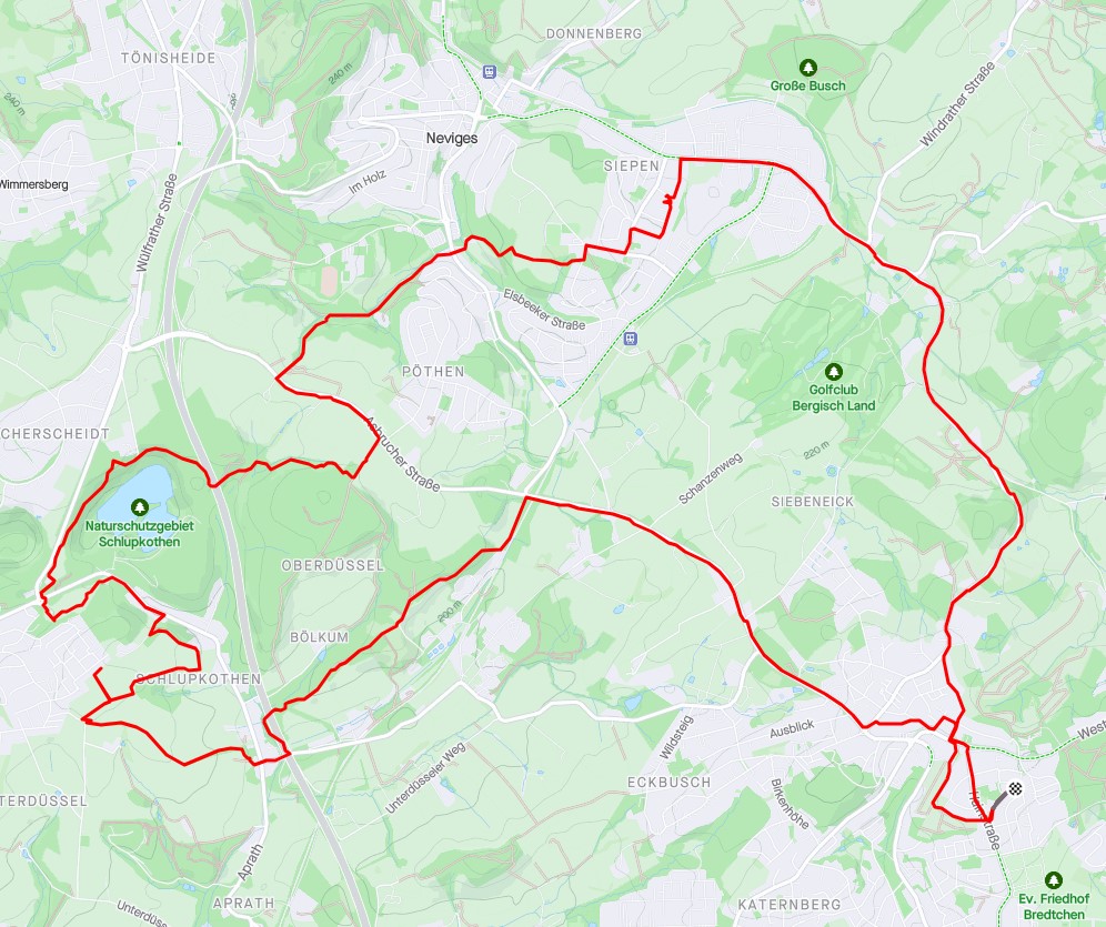 Tja, da sind wir dann also. Um 18:30h saĂen wir in den Satteln, kurz bequatscht, wohin es gehen könnte / soll (Schlammteich klingt erst nicht schlecht) und ab ging es. Im Wald kurz oberhalb des Nevigesers Panoramabad dann doch noch umentschieden und dann links abgebogen Richtung Nevigeser StraĂe.