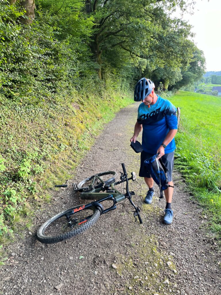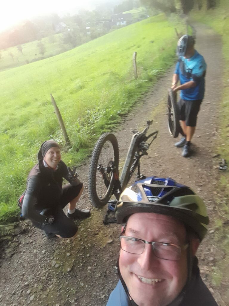 Also hieß es zunächst wieder: Zwangspause und Schlauch wechseln! Mühselig und sichtlich genervt (was aber auch den Selfie-Kanonen Schmiddie und KingLoui liegen kann 🤪😅) machte sich MrUphill dann ans Werk.
