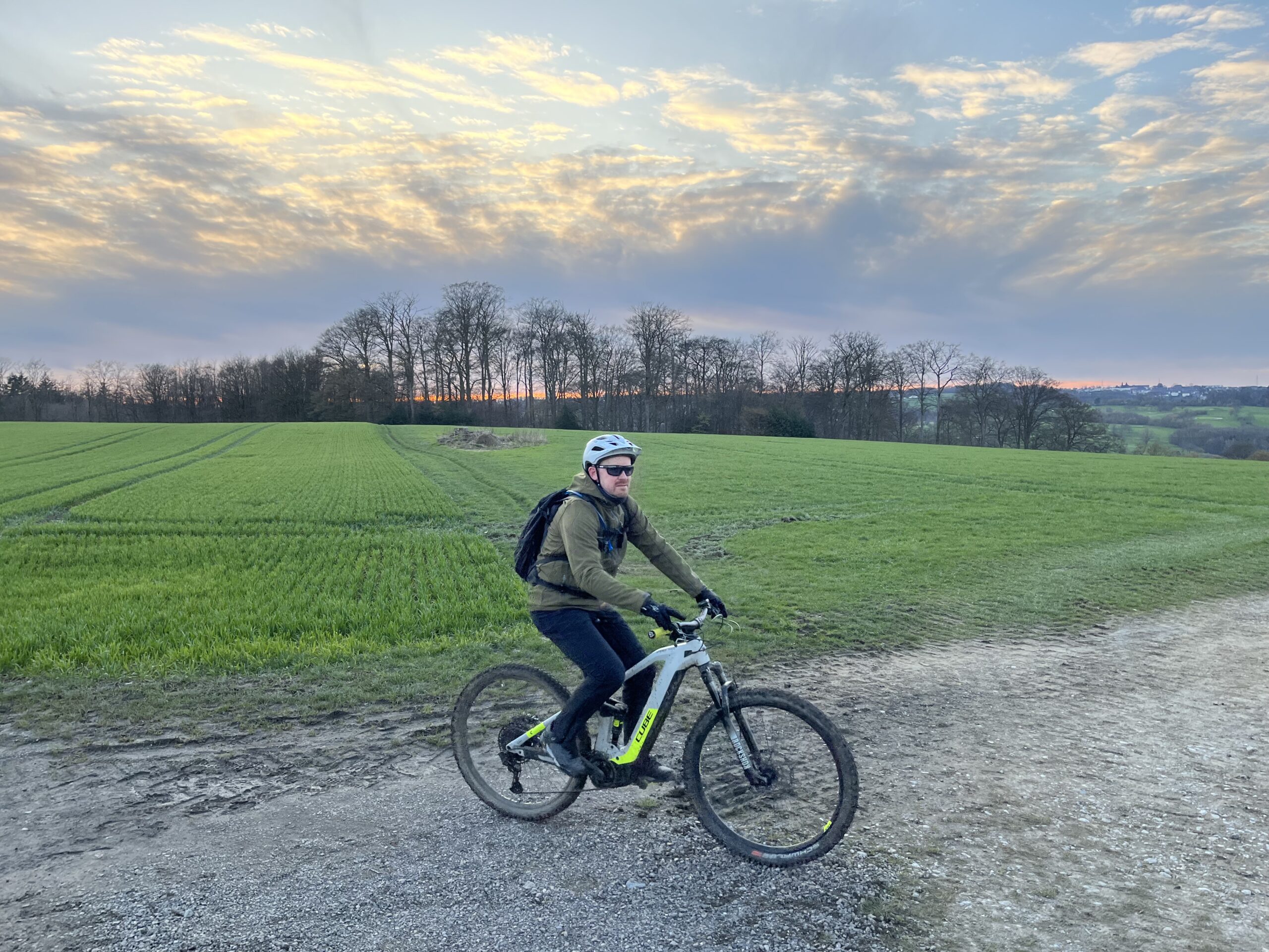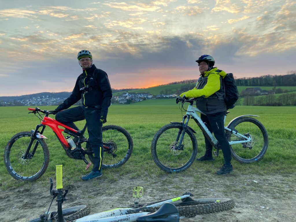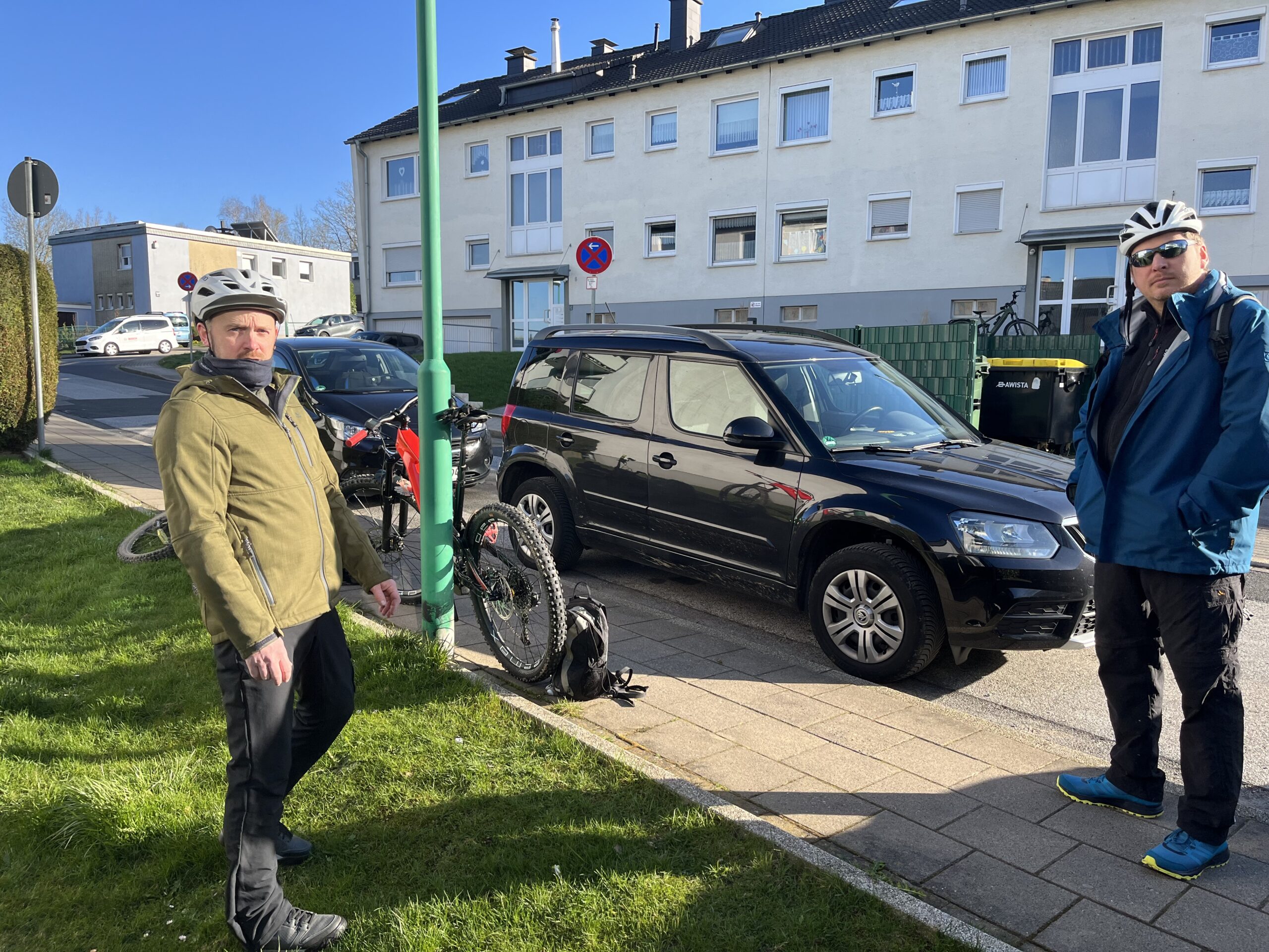 Somit waren wir also diesmal zu viert unterwegs, Holgi, Timmey, der Beckmann und ich. Es sollte für unsere zwei Winterschläfer erstmal gemütlich durch Wald und Wiesen gehen. Die Körperchen der kleinen müssen sich ja auch erstmal wieder an die ungewohnte Bewegung gewöhnen. Und so ging es dann entspannt los, bei bestem Wetter mit viel Guter Laune! Diese verließ Holgi dann schlagartig bei Kilometer 10, als er bemerkte: „Mein Schlüssel ist weg!“ Hä?! Wat für´n Schlüssel??? Na der vom Akku- uns vom Schloss. Anscheinend hatte er seine Jackentasche nicht richtig zu gemacht. Nachdem er gefühlt 20x seinen kompletten Rucksack aus und wieder eingepackt, diverse Taschen an Hose und Jacke durchwühlt hatte, war dann auch endgültig klar: ER ist weg! Wie stehen die Chancen ein Schlüssel Etui im Wald auf einer Strecke von ca. 10km zu finden?! Genau…