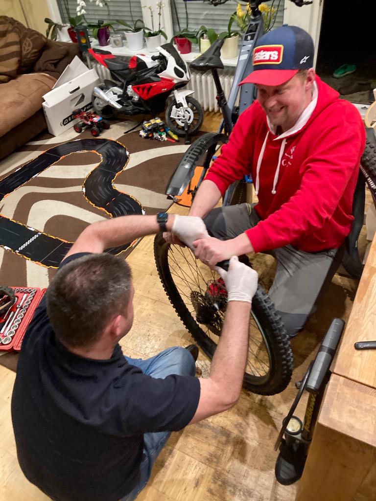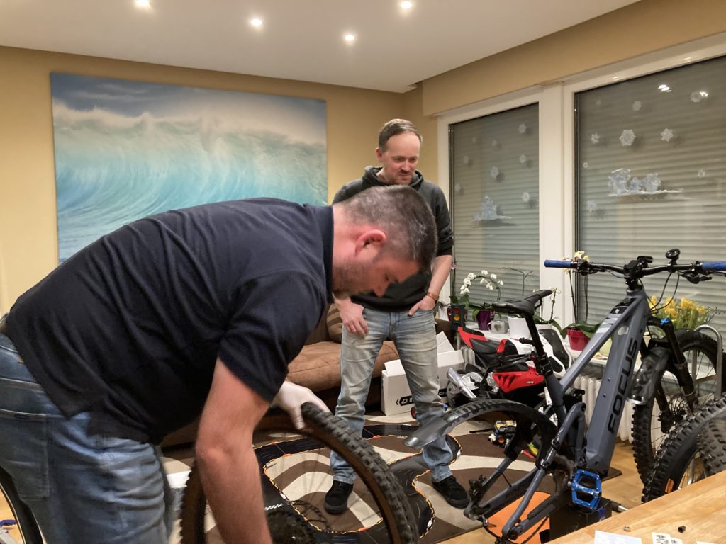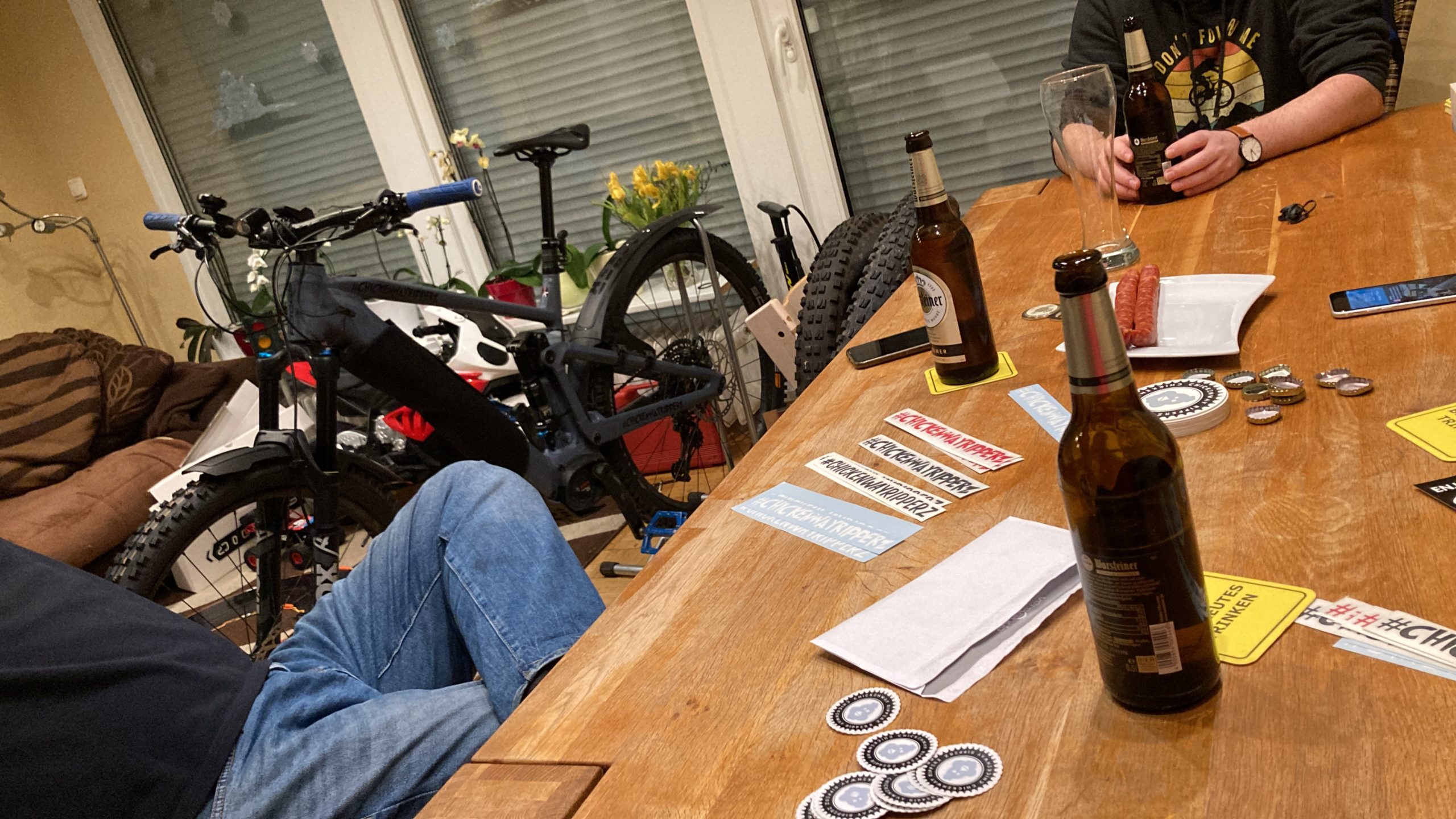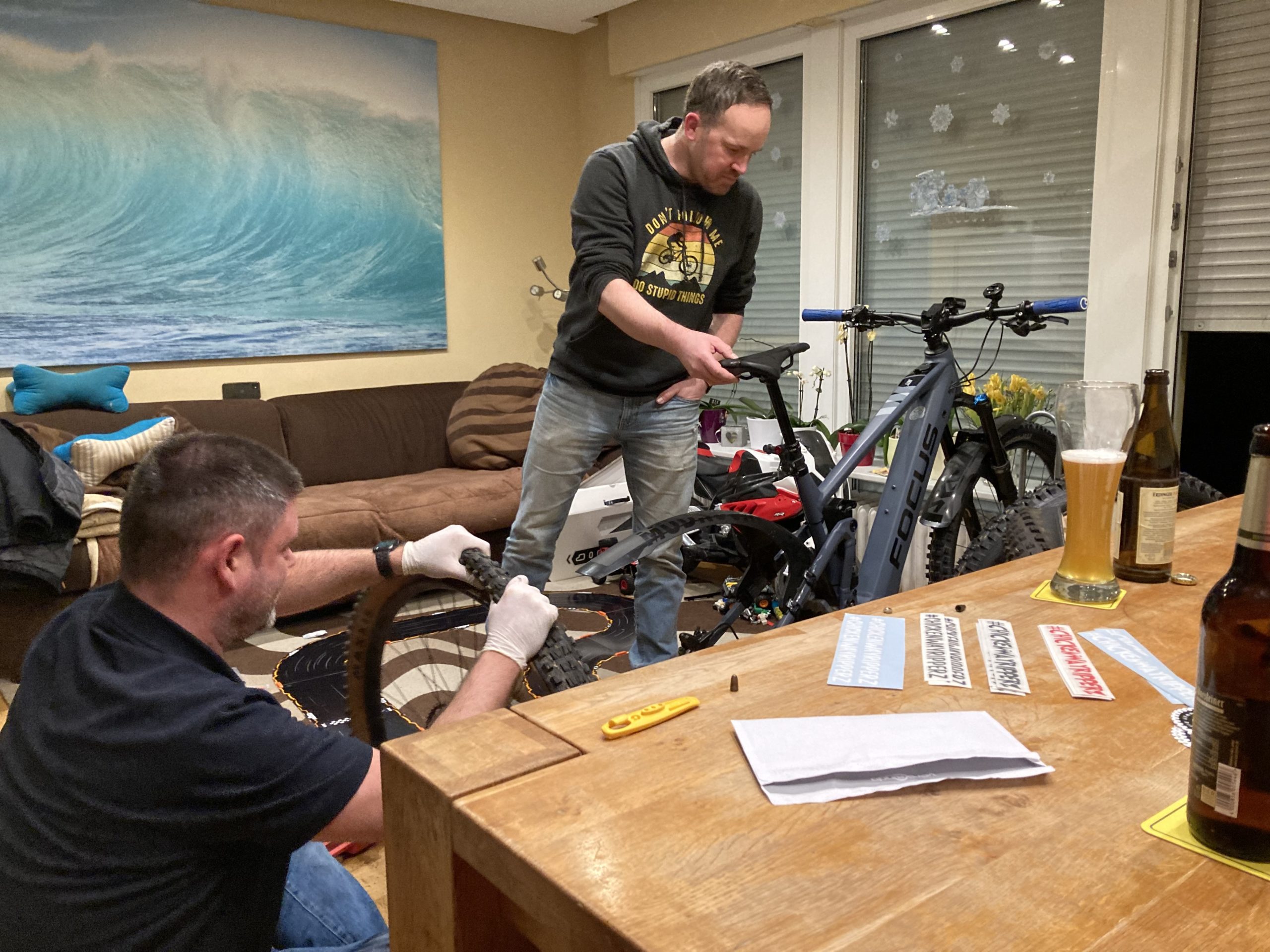 Sturm… ja… besser gesagt Orkan!!! So sahen die letzten Tage so wie auch das bevorstehende Wochenende aus… Also beschlossen wir (MrUphill, Der Beckmann und KingLoui) uns auf ein paar Bierchen zu treffen. Und weil es MrUphill immer noch nicht geschafft hatte seine Reifen zu wechseln, bot sich die Möglichkeit natürlich an, dieses zu verbinden. Naja… sagen wir mal so… ihm blieb keine andere Wahl! Sichtlich gestresst, weil er schnell noch sein Bike im Dunkeln putzen musste, begrüßten wir MrUphill und stießen zugleich mit dem ersten Fläschchen an. Das Bike wartete schon, wie von uns gefordert, im Wohnzimmer auf uns. Also erstmal ne Pizza in den Ofen geschossen und noch die ein oder andere Hopfenkaltschorle auf den Tisch. Wer will denn an so einem Abend auch am Bike „schrauben“?!?! Irgendwann haben wir dann doch noch begonnen, uns MrUphills Bike zu widmen. Zusätzlich zu den neuen Reifen gab es dann direkt auch noch nen paar neue „Sticker“…!!! BikePornDeluxe!!!