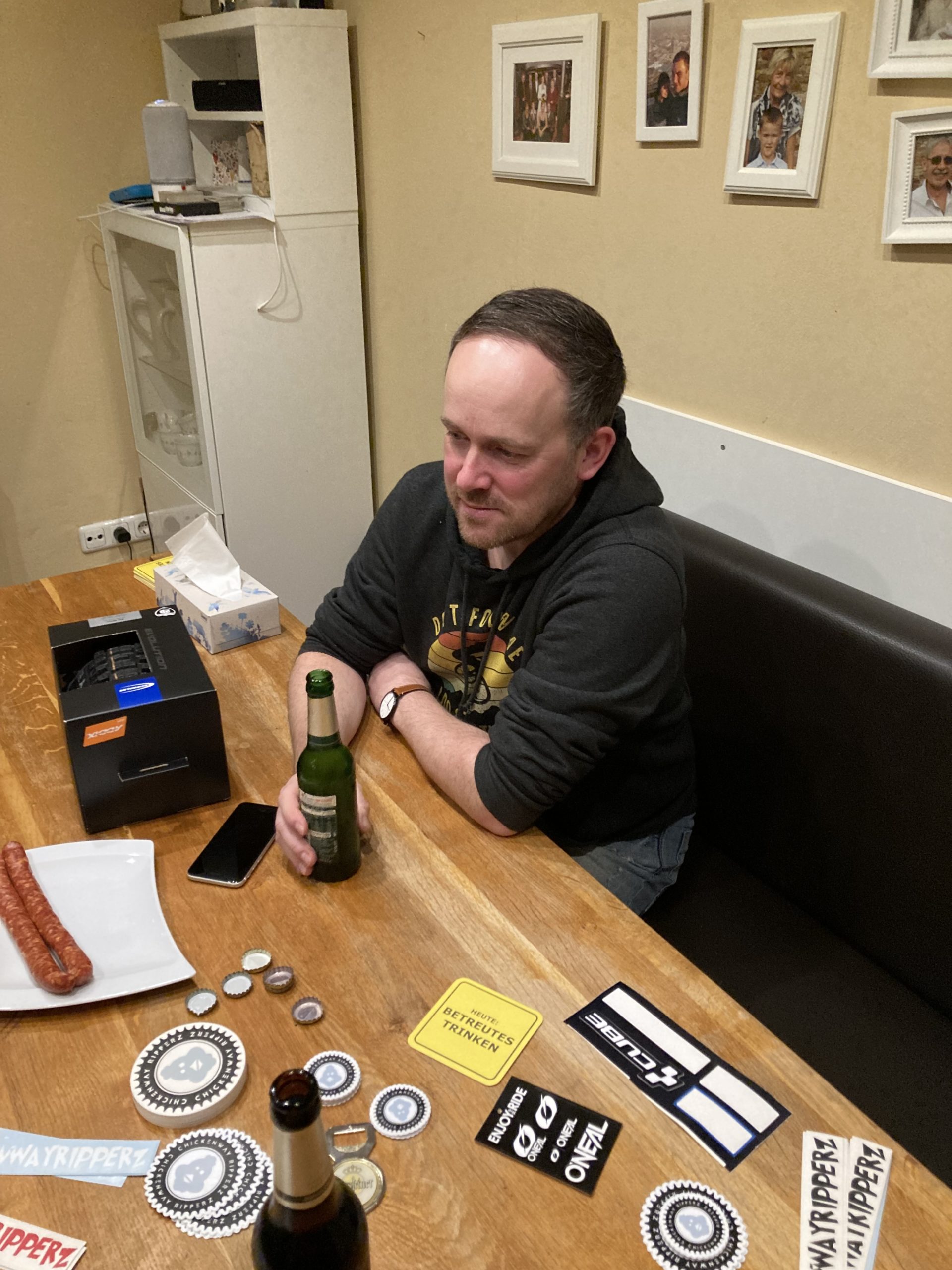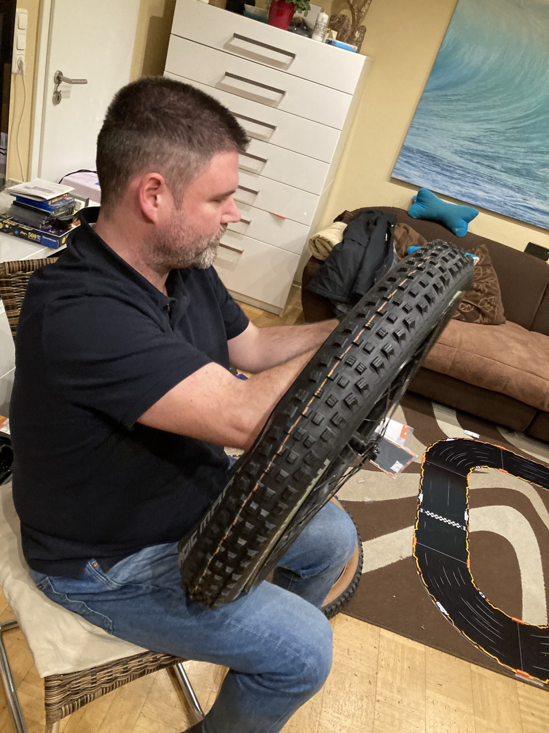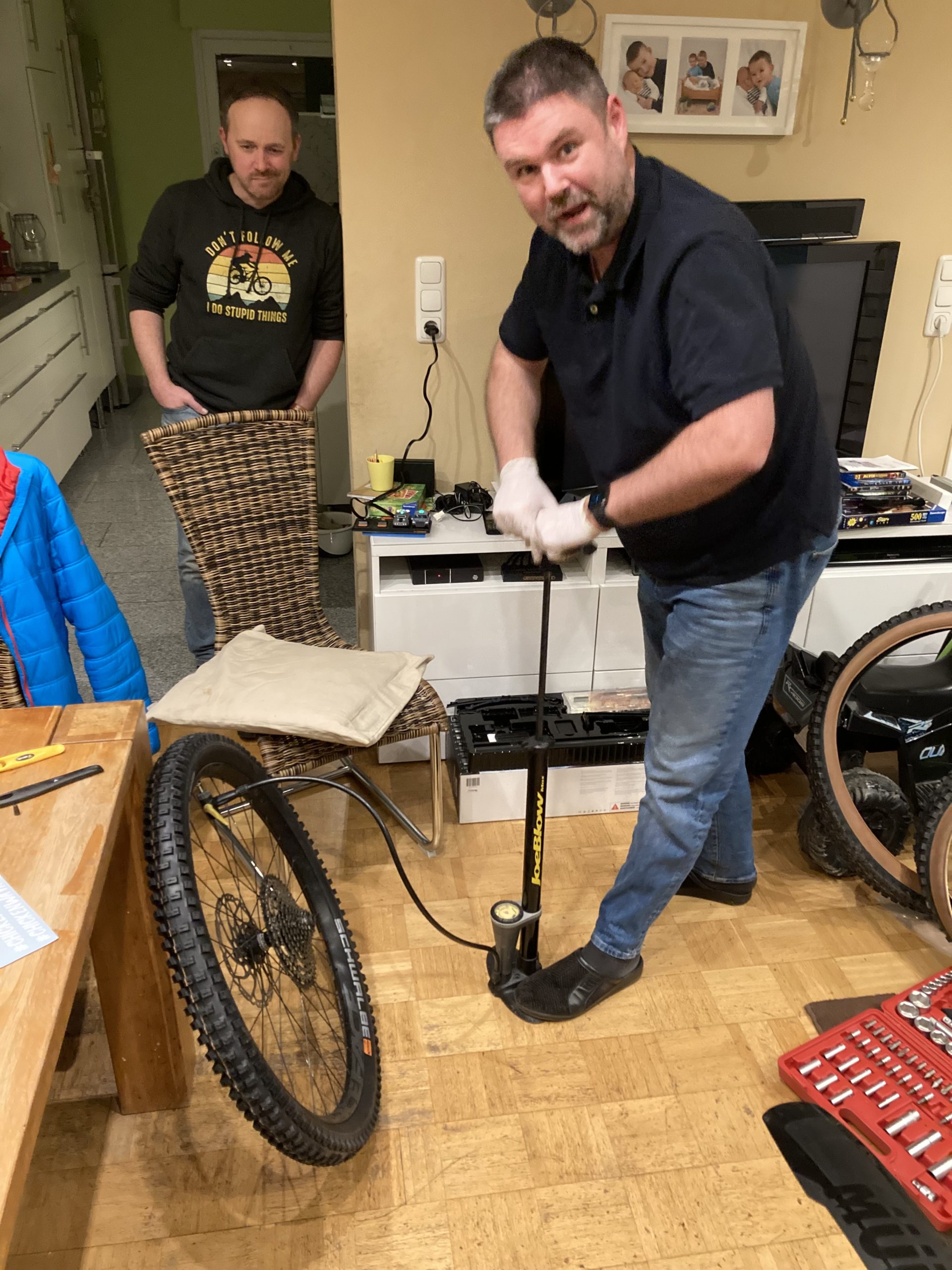 Sturm… ja… besser gesagt Orkan!!! So sahen die letzten Tage so wie auch das bevorstehende Wochenende aus… Also beschlossen wir (MrUphill, Der Beckmann und KingLoui) uns auf ein paar Bierchen zu treffen. Und weil es MrUphill immer noch nicht geschafft hatte seine Reifen zu wechseln, bot sich die Möglichkeit natürlich an, dieses zu verbinden. Naja… sagen wir mal so… ihm blieb keine andere Wahl! Sichtlich gestresst, weil er schnell noch sein Bike im Dunkeln putzen musste, begrüßten wir MrUphill und stießen zugleich mit dem ersten Fläschchen an. Das Bike wartete schon, wie von uns gefordert, im Wohnzimmer auf uns. Also erstmal ne Pizza in den Ofen geschossen und noch die ein oder andere Hopfenkaltschorle auf den Tisch. Wer will denn an so einem Abend auch am Bike „schrauben“?!?! Irgendwann haben wir dann doch noch begonnen, uns MrUphills Bike zu widmen. Zusätzlich zu den neuen Reifen gab es dann direkt auch noch nen paar neue „Sticker“…!!! BikePornDeluxe!!!