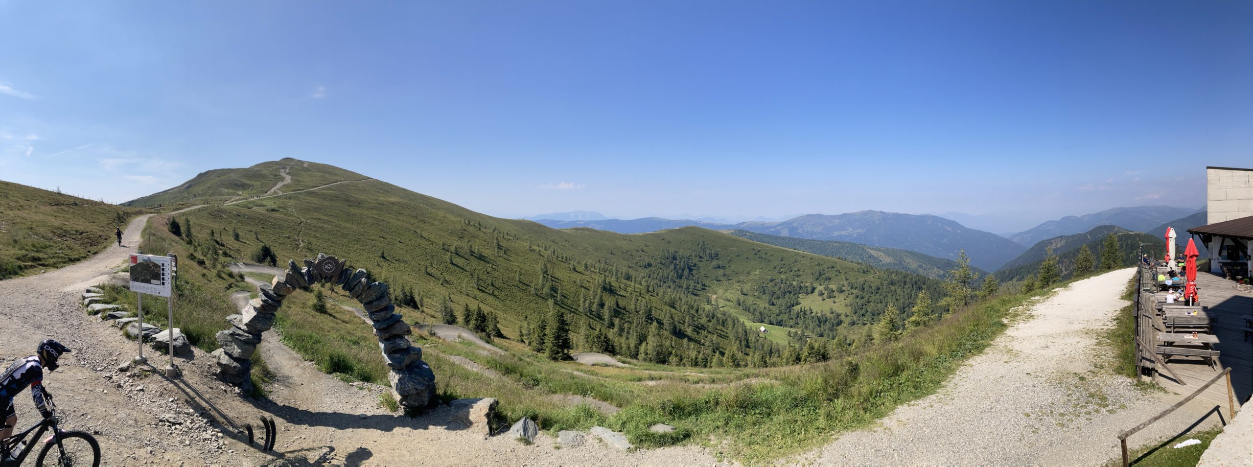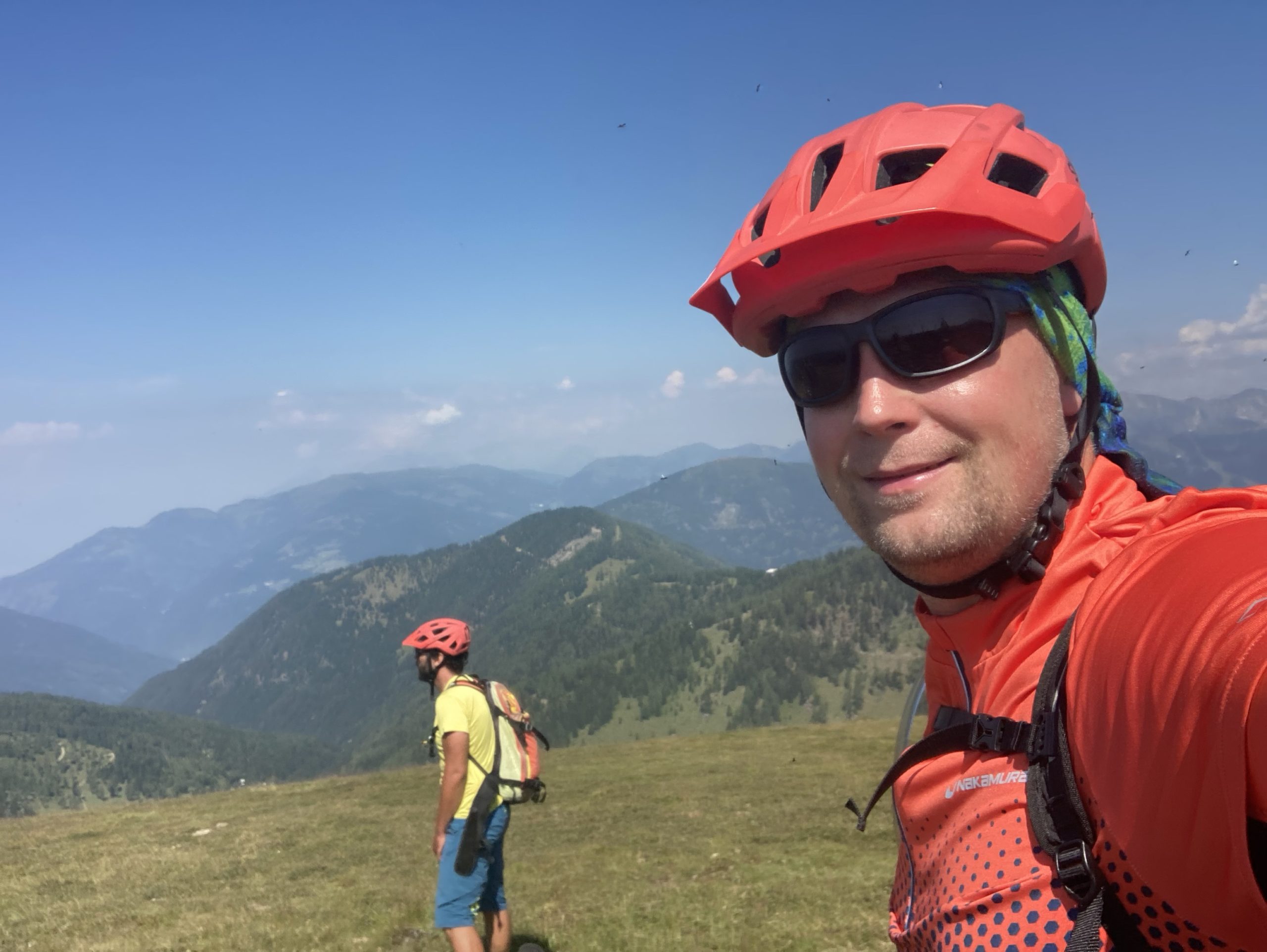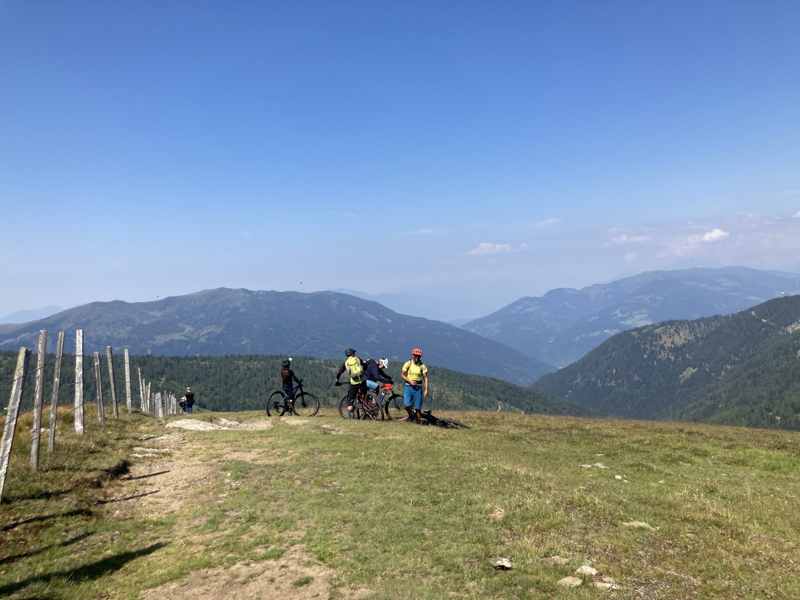 Aber wenn man schon mal hier ist, dann geht’s natürlich auch ab auf den Berg. Mit dem Bike natürlich 😜 und was machen wenn man Bike dabei hat?! Na klar, leihen! Aber alleine die Trails erkunden?! Lieber von nem Lokal die besten Trail zeigen lassen! Gesagt getan, zusammen mit der Sportschule Krainer aus Feld am See ging es Donnerstag morgen um 9 Uhr von der Talstation Bad Kleinkirchheim mit der Gondel hoch zur Berstation. Oben angekommen erstmal das Panorama genießen und… oh, da geht’s auch schon los… die letzten 150Hm zum Gipfelkreuz des Wöllaner Nock wollen dann doch noch pedaliert werden. Und das auf nur knapp 1000m Wegstrecke. Genau mein Ding!!! Nach den ersten Metern stellte ich dann leider auch fest, das YT Capra ist nicht unbedingt die angenehmste Art um den Gipfel an zu fahren!🫣 Gefühlt 10kg zu schwer, extrem träge und mindestens 3 Gänge zu wenig lautete mein Fazit nach den ersten Höhenmetern. 🥵