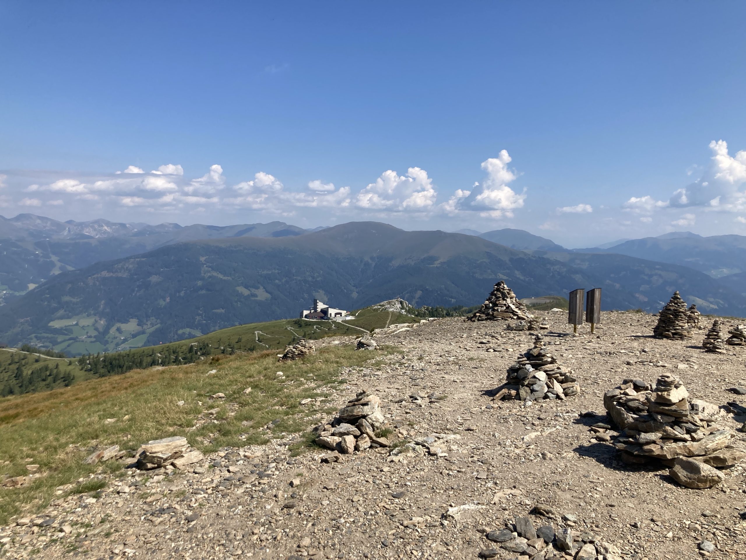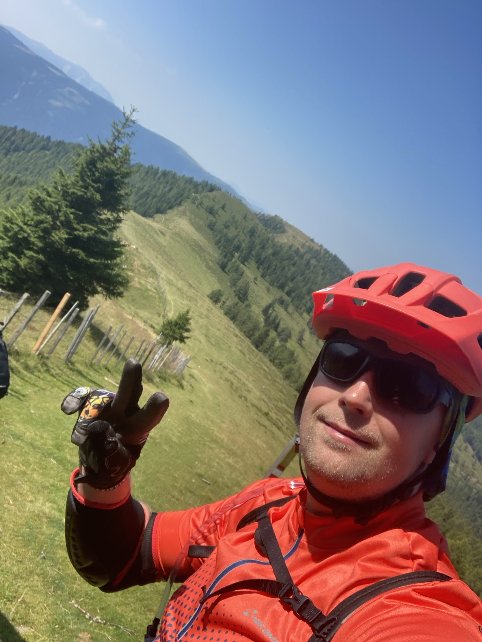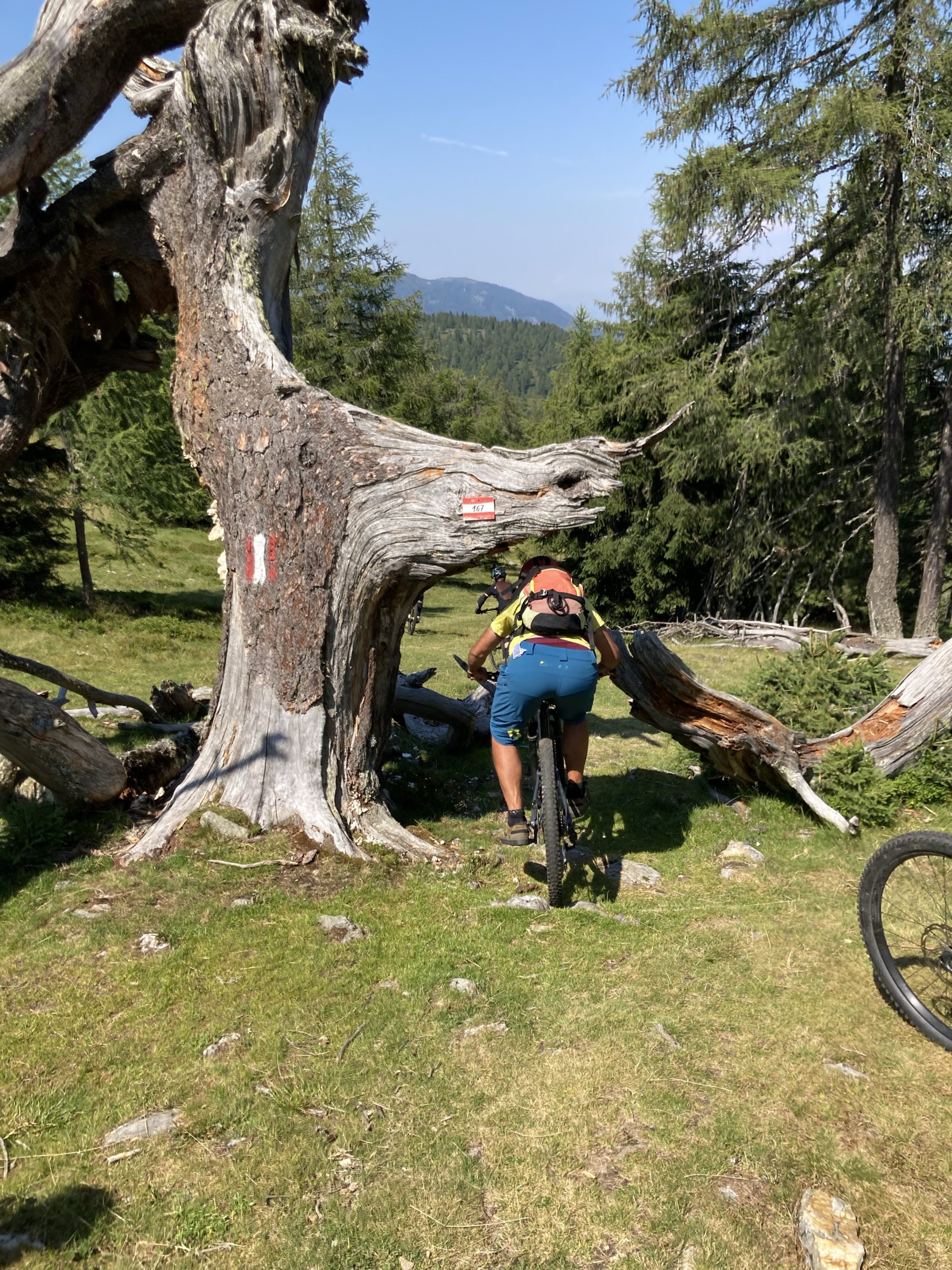 Aber wenn man schon mal hier ist, dann geht’s natürlich auch ab auf den Berg. Mit dem Bike natürlich 😜 und was machen wenn man Bike dabei hat?! Na klar, leihen! Aber alleine die Trails erkunden?! Lieber von nem Lokal die besten Trail zeigen lassen! Gesagt getan, zusammen mit der Sportschule Krainer aus Feld am See ging es Donnerstag morgen um 9 Uhr von der Talstation Bad Kleinkirchheim mit der Gondel hoch zur Berstation. Oben angekommen erstmal das Panorama genießen und… oh, da geht’s auch schon los… die letzten 150Hm zum Gipfelkreuz des Wöllaner Nock wollen dann doch noch pedaliert werden. Und das auf nur knapp 1000m Wegstrecke. Genau mein Ding!!! Nach den ersten Metern stellte ich dann leider auch fest, das YT Capra ist nicht unbedingt die angenehmste Art um den Gipfel an zu fahren!🫣 Gefühlt 10kg zu schwer, extrem träge und mindestens 3 Gänge zu wenig lautete mein Fazit nach den ersten Höhenmetern. 🥵