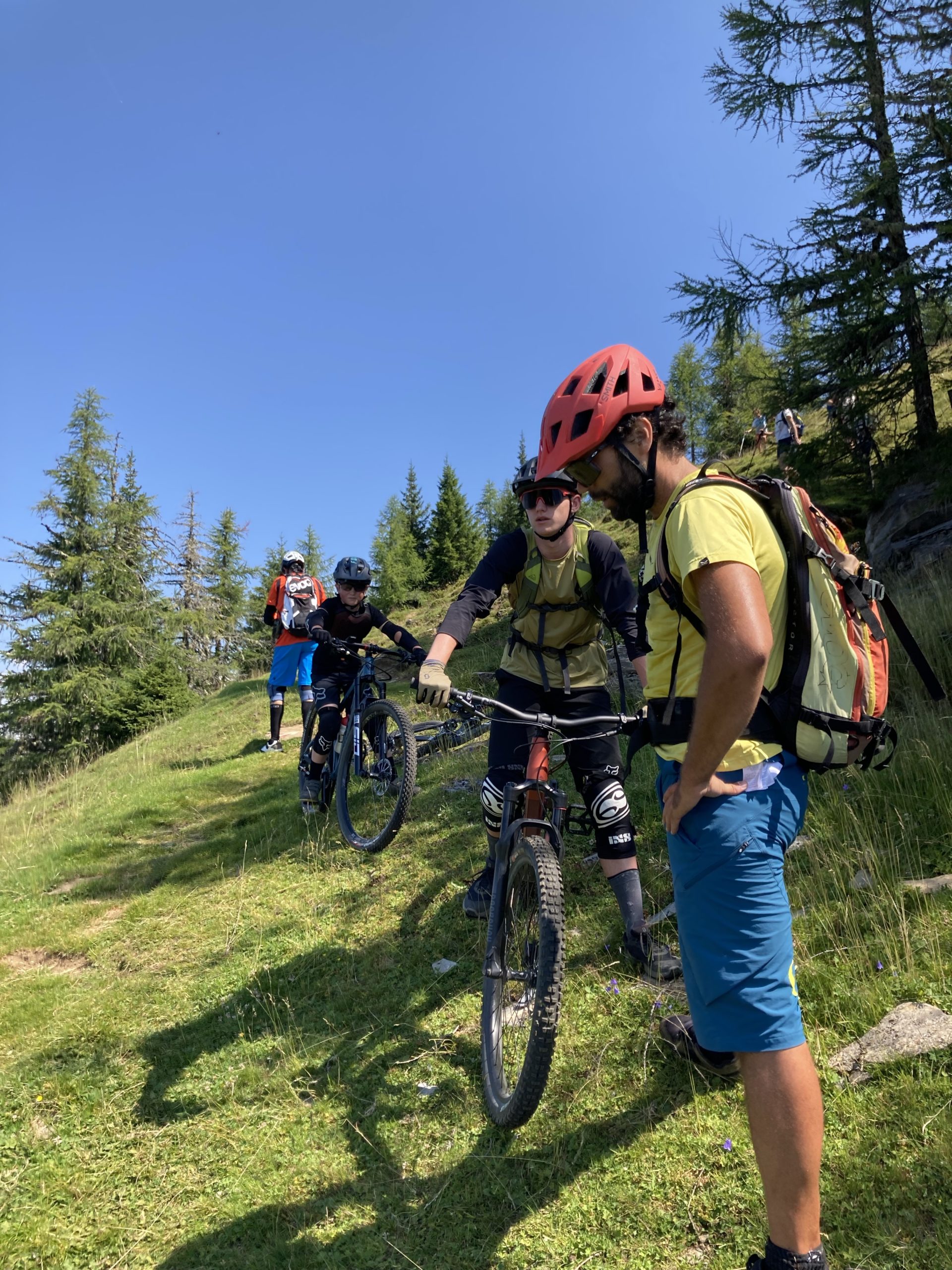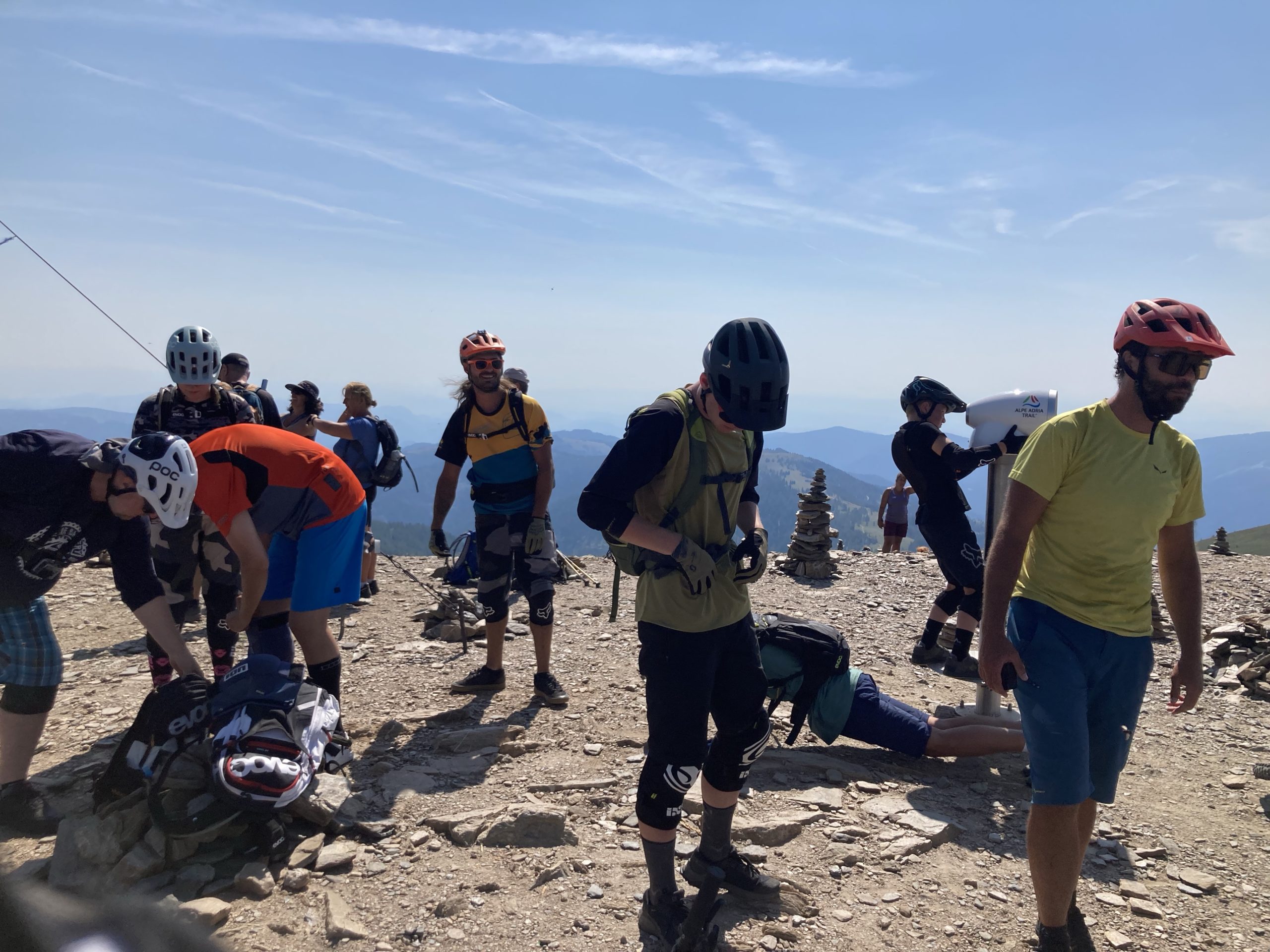 Endlich oben angekommen, sammelte sich die Truppe dann langsam. Natürlich nachdem die klassischen Panorama Fotos im Kasten waren. Der Puls war nun auch wieder im Normalbereich angelangt, Protektoren waren angelegt und es folgte eine kurze Einweisung sowie Trail Besprechung.